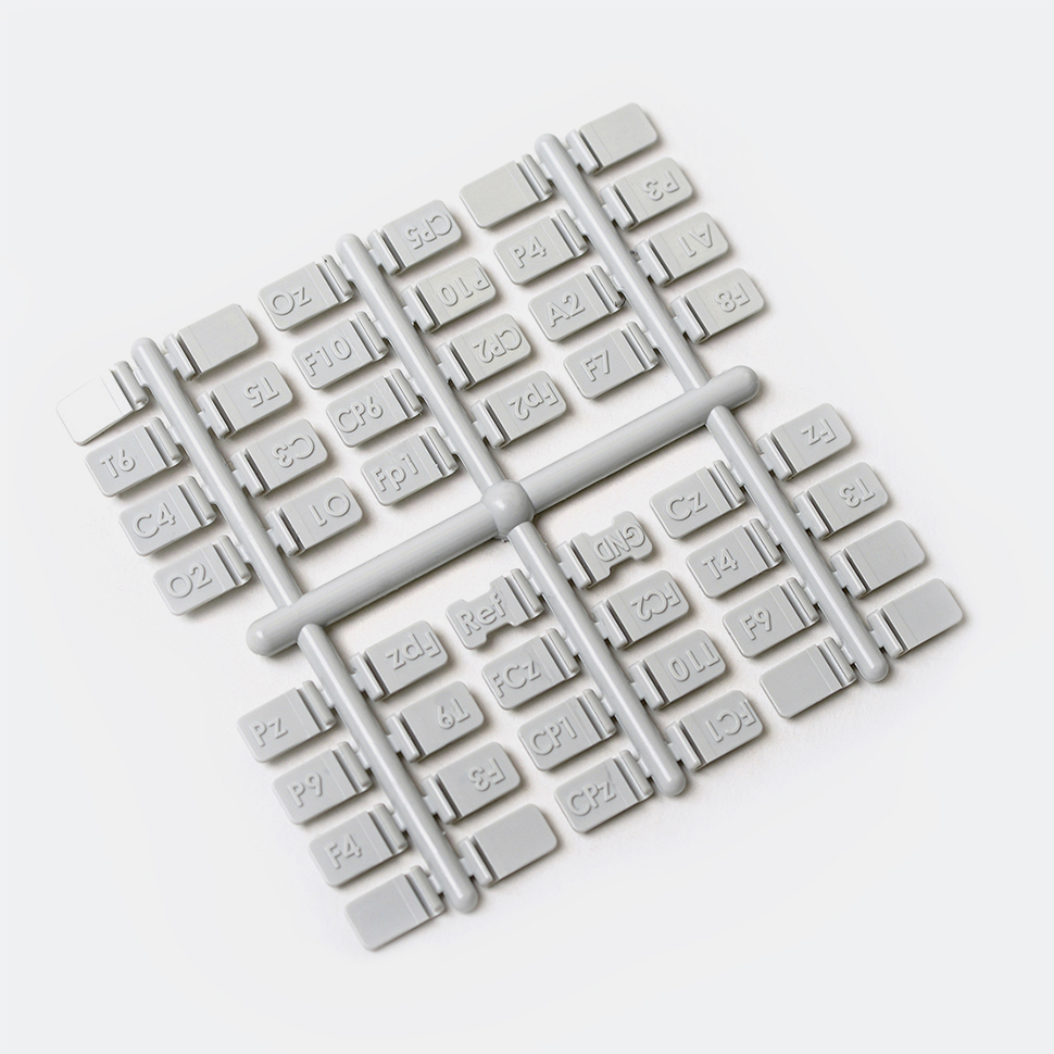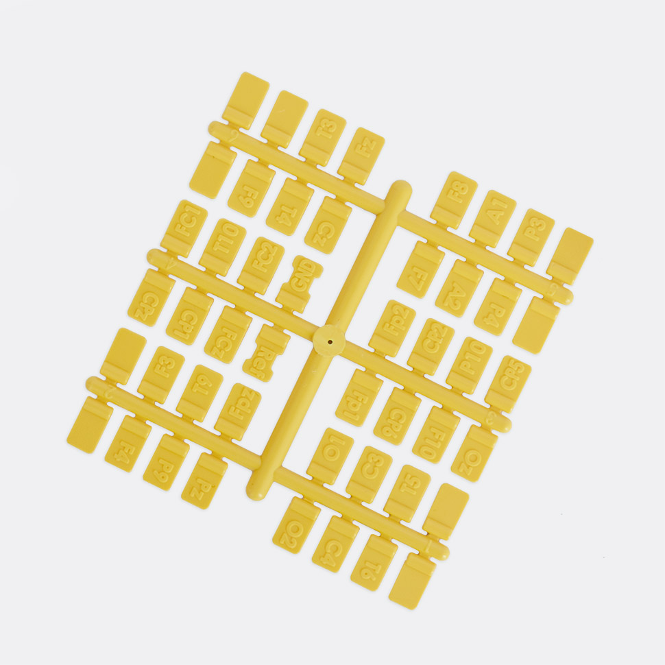 A set of plastic markers of the type with symbols of the most common positions of the EEG electrodes is designed to be attached to the wires of EEG electrodes. The symbols on the markers correspond to the international system 10-20. Blank labels are intended for self-application of the symbol.