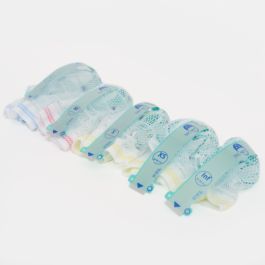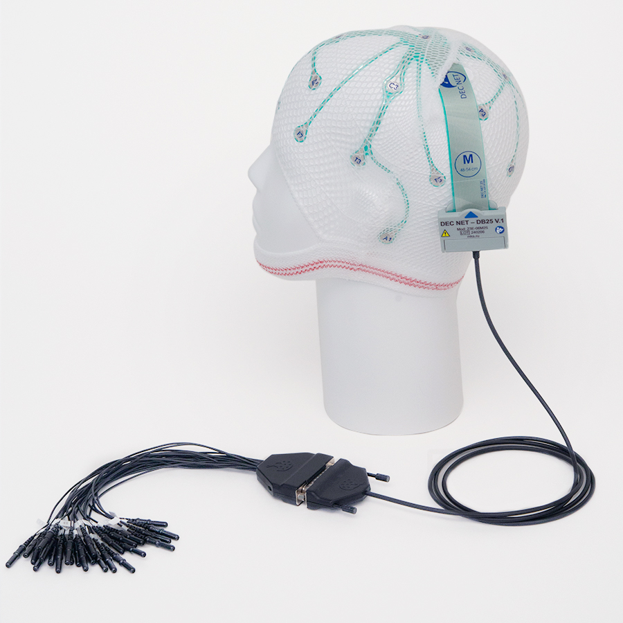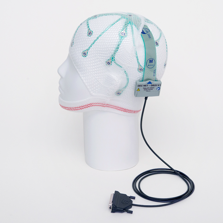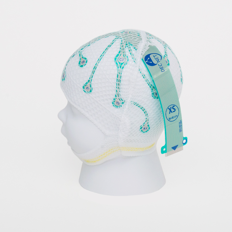 Electrode cap DEC NET is a disposable electrode cap, which consists of a flexible base with contact pads of electroencephalographic leads, fixed on a mesh retainer. The mesh retainer is designed to position and hold the electrode base on the patient's head.