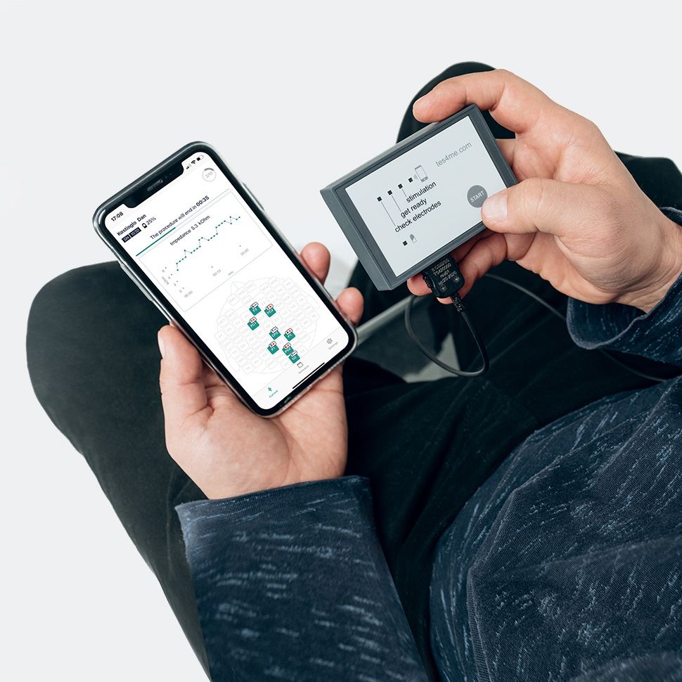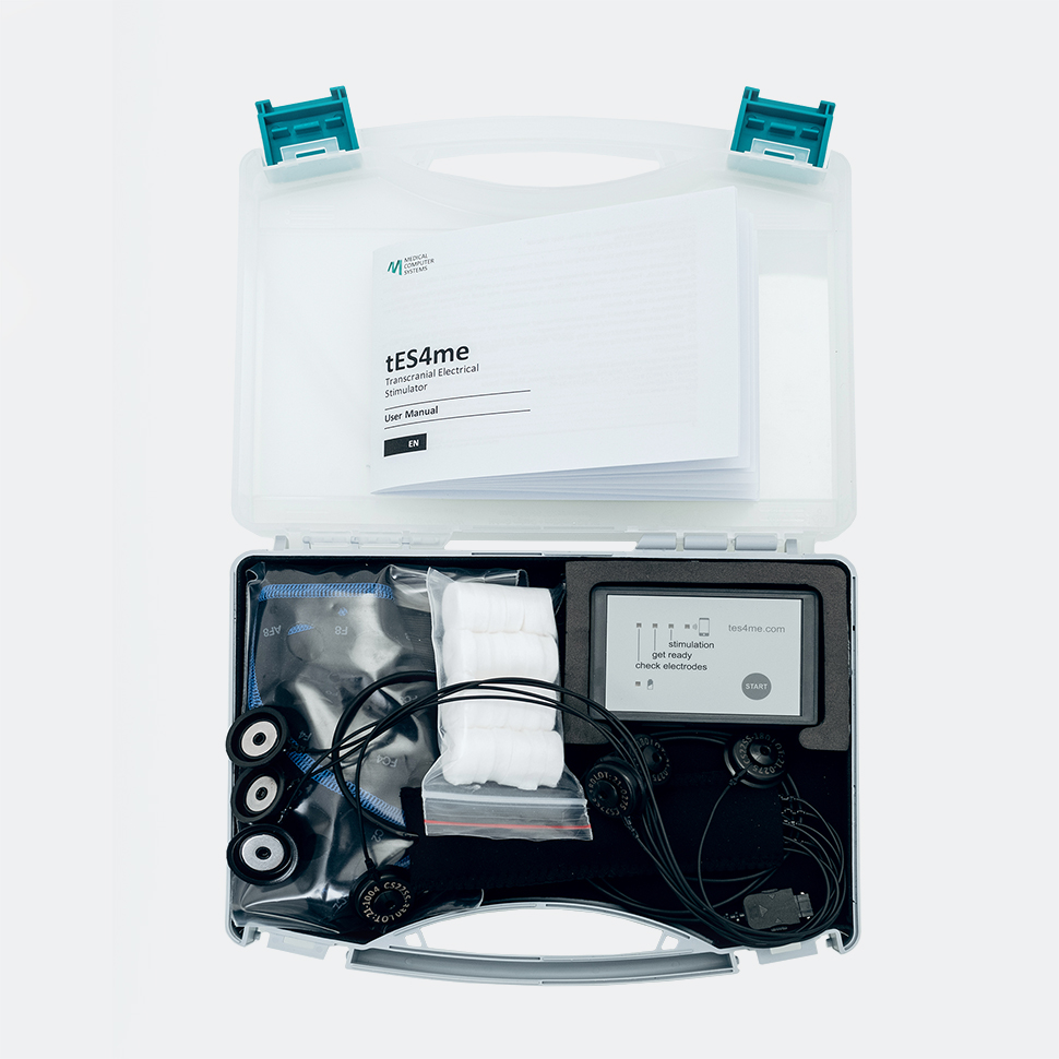 Транскраниальный электростимулятор tes4me is a programmable portable 8-channel generator of electric current of modulated frequency and amplitude (hereinafter referred to as an electronic unit or stimulator) with control elements, a set of non-invasive stimulation electrodes and accessories. The product operates from an internal power source (battery).