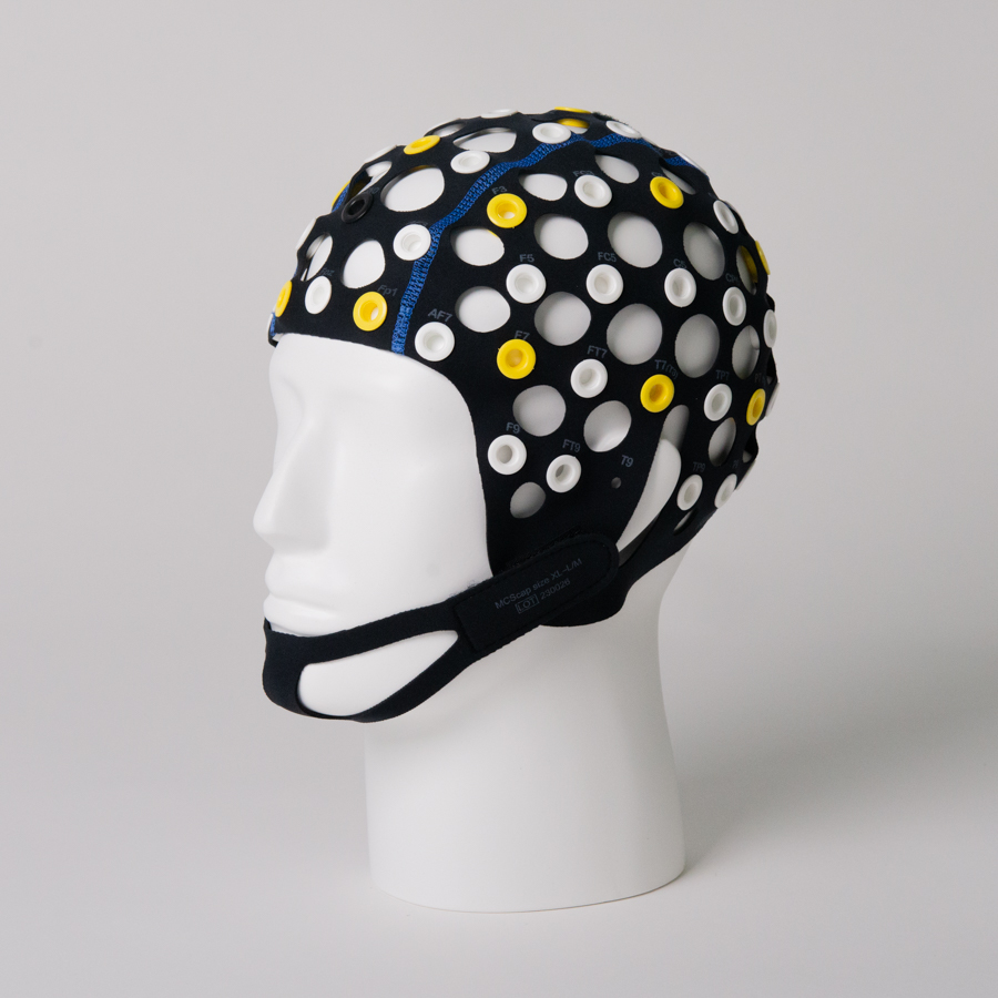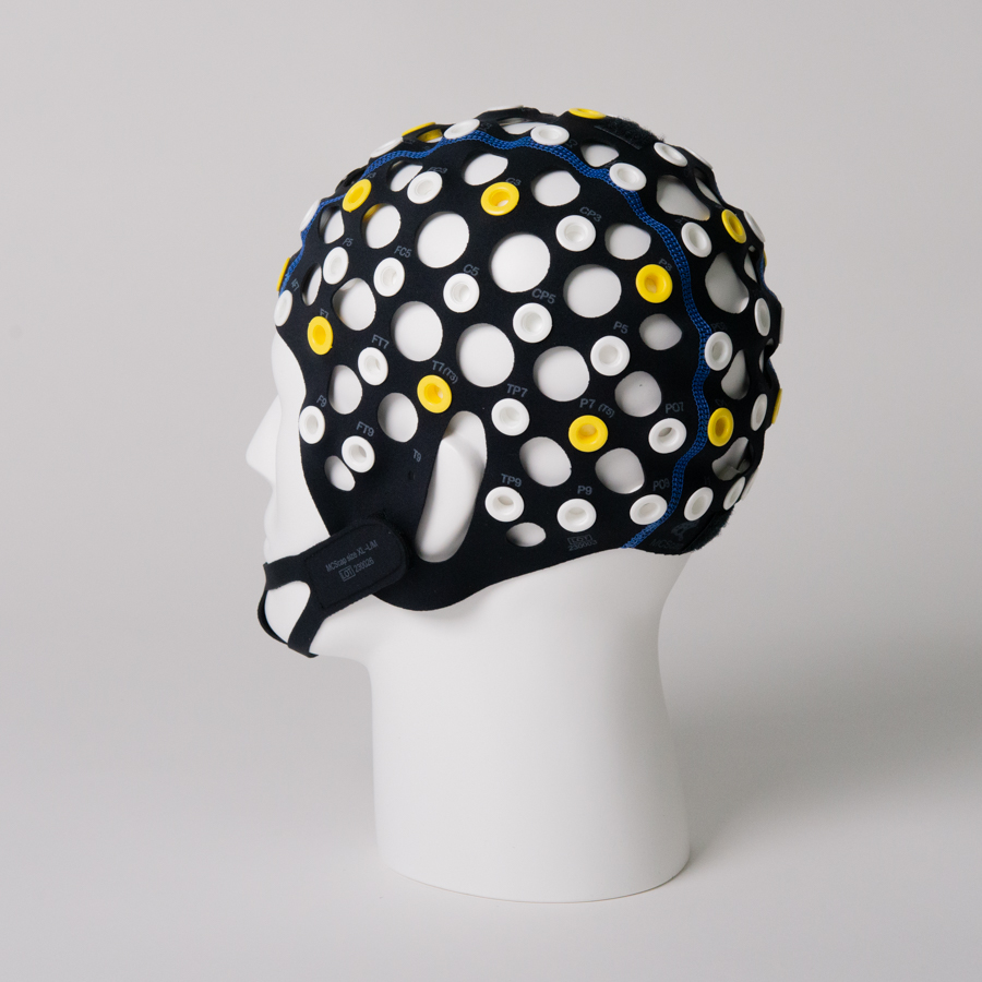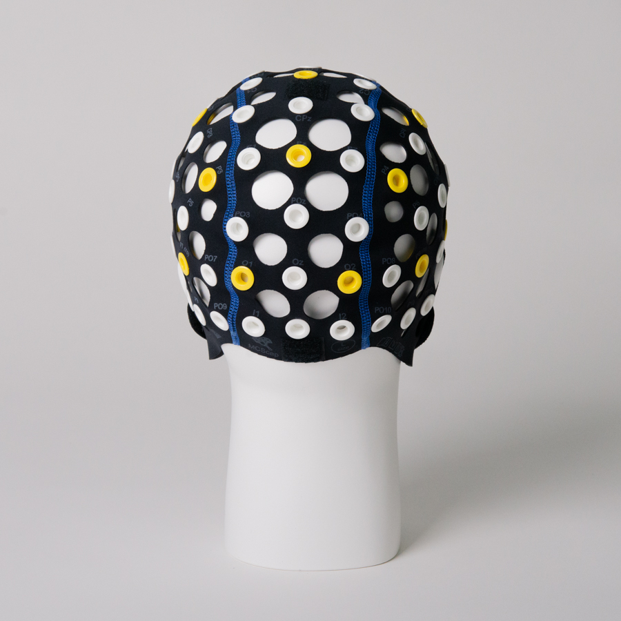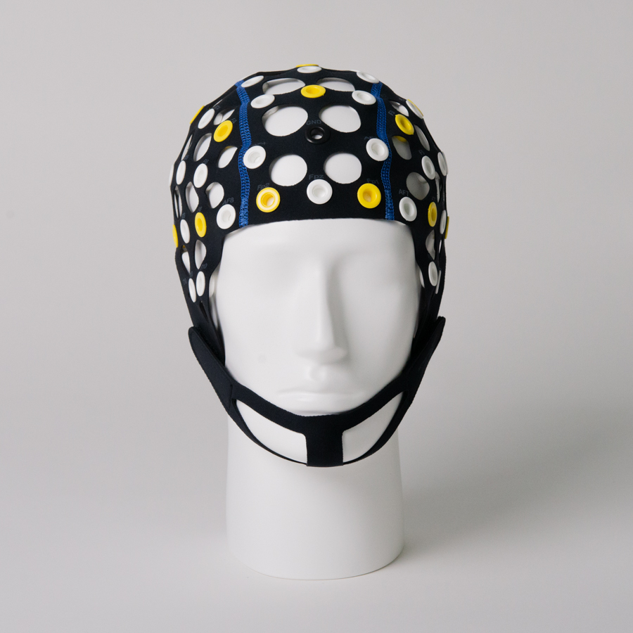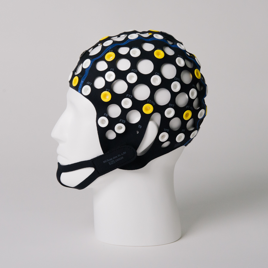 MCScap‑74 is a marked textile cap with up to 74 fixing rings, placed according to the international 10‑10 system. Rings in the cap are designed to install point MCScap‑E electrodes. Textile cap is made of elastic material, preserving the shape and size. The cap provides the exact position of the electrodes on the head without additional measurements and adjustments. Large holes are provided for ventilation and access to the electrodes and patient’s skin. The cap is fixed on the head with the chin or chest belt. Size identification is carried out by the color of the seam.